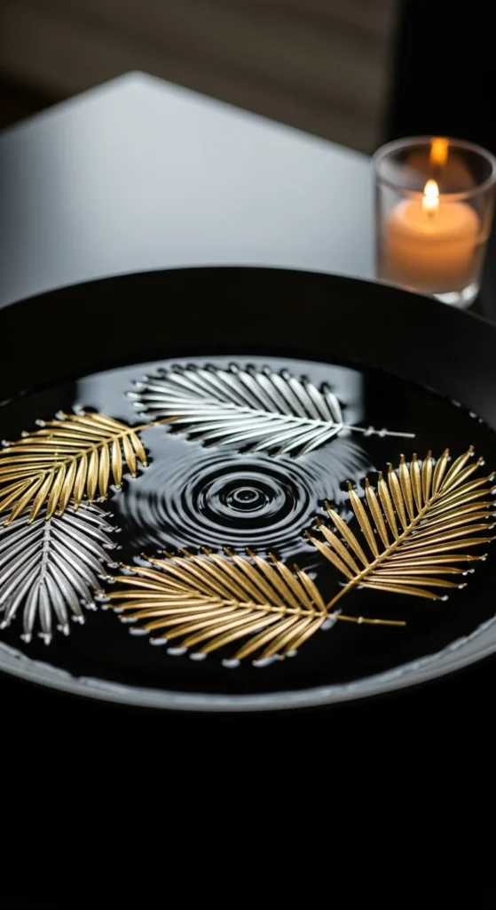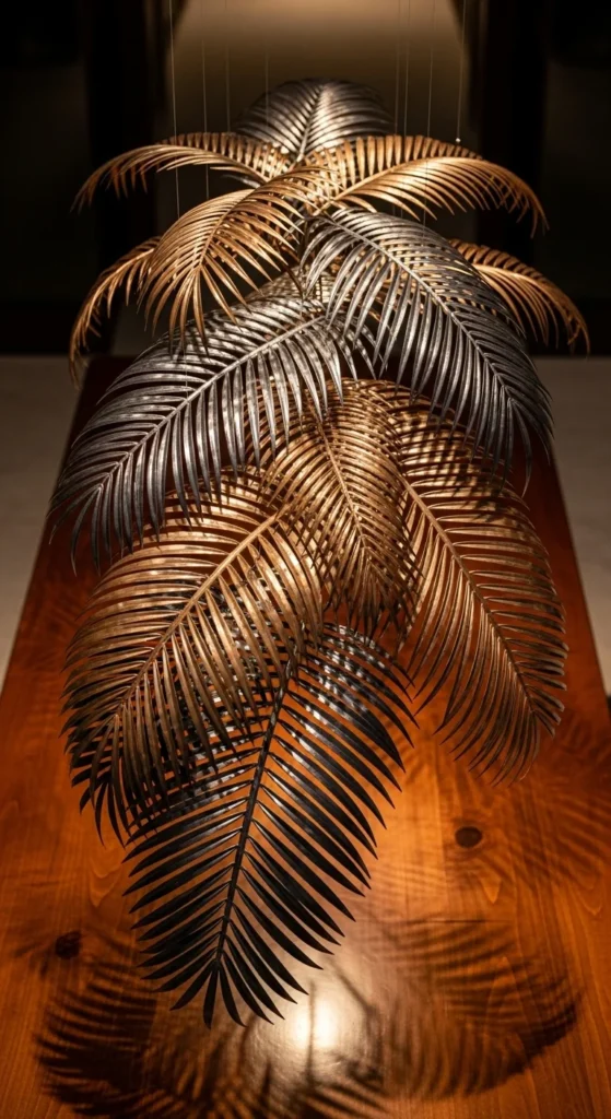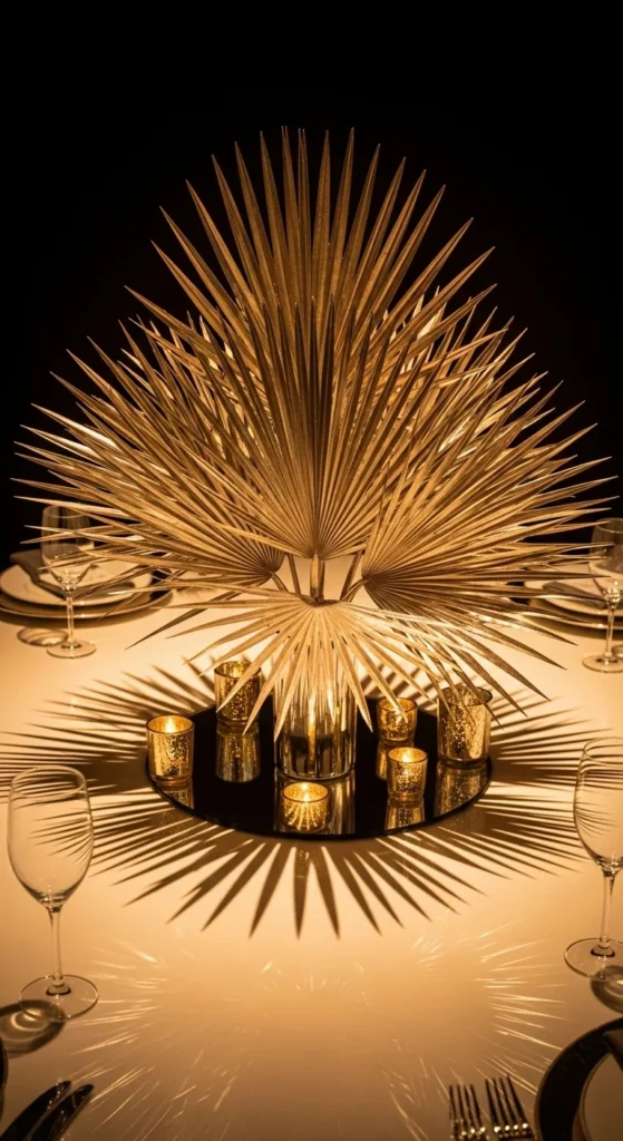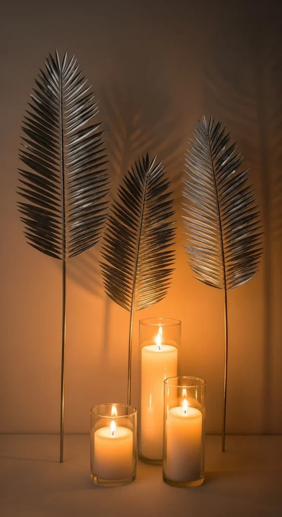 Place metallic palm fronds inside a shallow glass bowl filled with water. The water creates soft reflections. Add floating candles for extra glow. Use faux fronds with water-resistant coatings. For lower cost, coat plain faux fronds with a clear sealer after painting. This centerpiece feels airy and works well for relaxed dining settings.