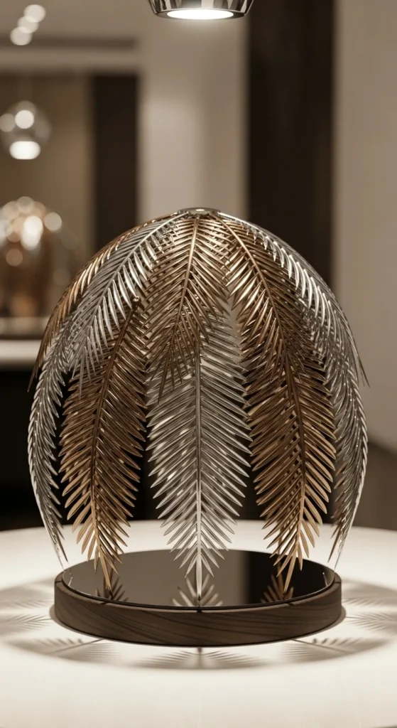 Shape metallic palm fronds into a loose sphere by overlapping them in a circular container. Keep stems hidden inside foam. Add a small LED light in the center for internal glow. A cost-friendly approach is mixing a few metallic fronds with matte filler leaves. This sculptural centerpiece works well on wide tables.