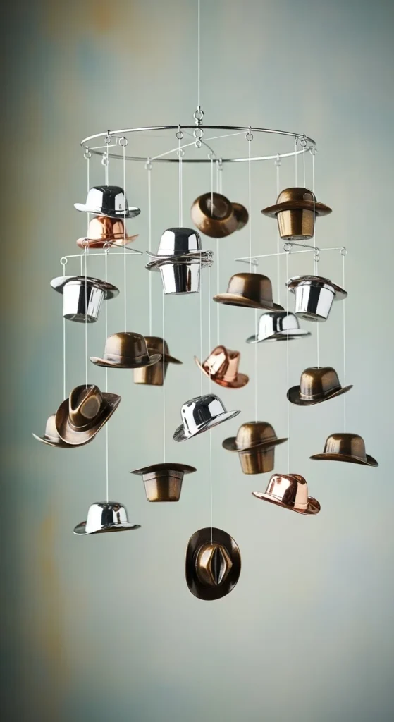 Make a mobile using lightweight metallic hats and fishing line. Hang the hats at different lengths from a circular frame. Place the mobile above a bar cart, corner table, or entryway. The hats catch light beautifully as they move. For a cost-friendly option, use mini hats instead of full-size ones—they’re lighter and cheaper. Add beads or small ornaments between the hats for detail. Keep the mobile high enough so no one bumps into it. This décor piece adds dimension without clutter.