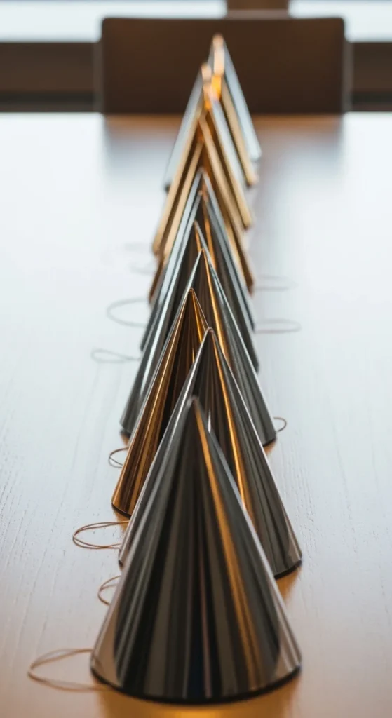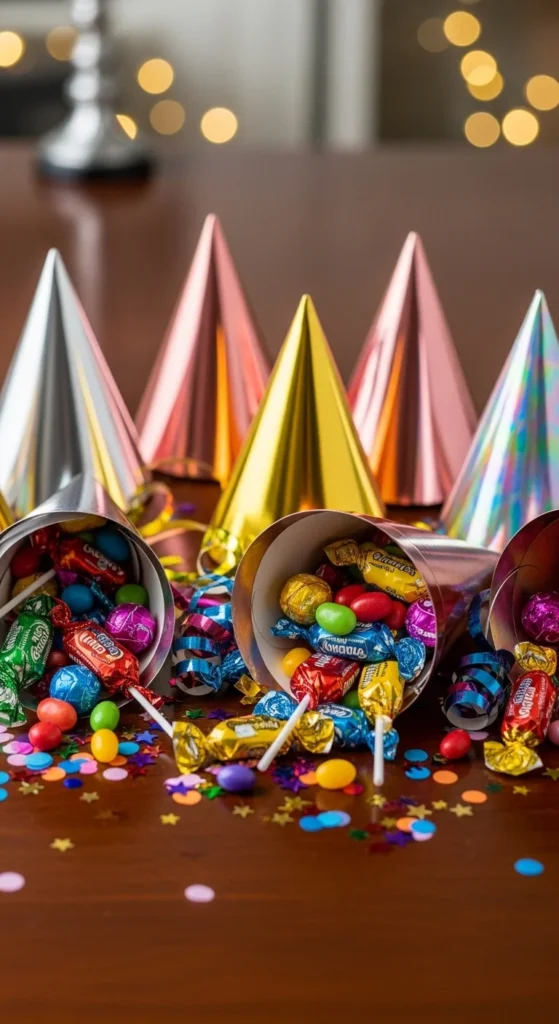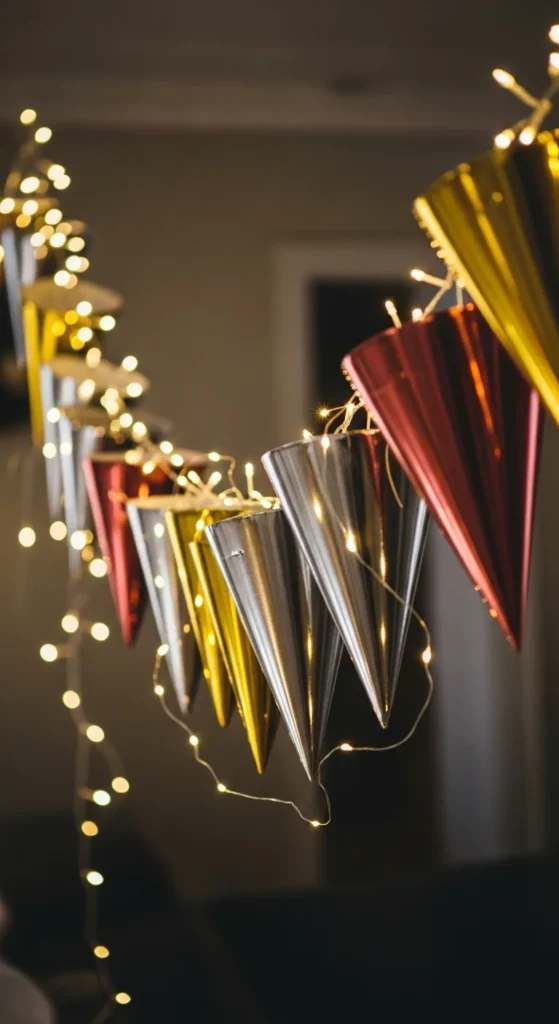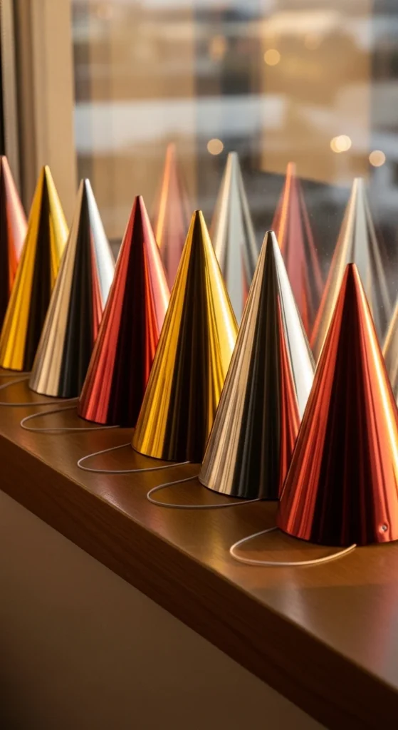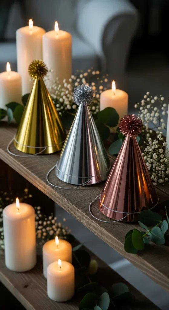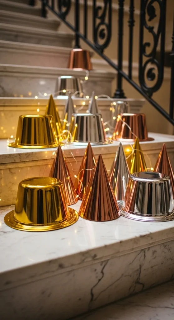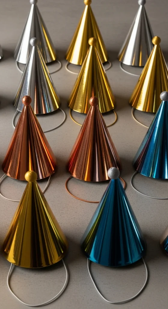 Metallic party hats bring instant energy to New Year décor. Their shine, simple shapes, and playful feel make them perfect accents for tables, shelves, walls, and entryways. You can mix colors, sizes, and finishes to create a look that feels spirited without spending much. Whether you’re styling a party setup or giving your living room a fun seasonal twist, these ideas help you use metallic hats in creative, easy ways that fit any space.