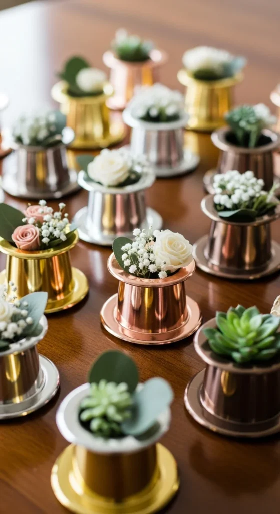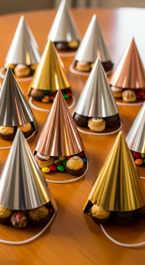 Turn metallic hats into party favors by filling them with small candies, noise makers, or confetti. Place the hats upside-down so the items sit inside easily. Wrap a ribbon around the base to keep everything together. This idea makes your table feel more interactive and gives guests something fun to grab. If you’re saving money, limit the fillers to simple sweets. Add a small tag or sticker to personalize each favor. Arrange the hats in rows or clusters depending on your table size. Their shine draws attention even when using minimal extras. This is an easy way to create themed décor that also doubles as a takeaway.