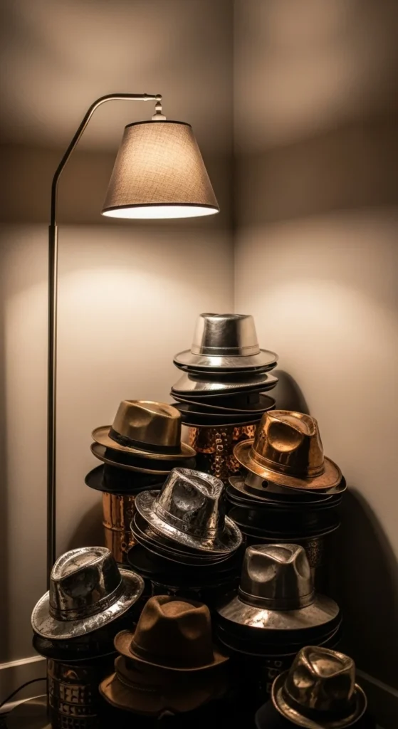 Fill an empty corner with grouped metallic hats. Use different sizes and finishes to make the area lively. Place them near a floor lamp so light bounces off the surfaces. Add a few ornaments or bead strands on the floor around them for extra texture. If you’re saving money, limit the setup to two hats only—the shine still creates strong visual interest. This idea adds energy to unused corners without requiring furniture.
