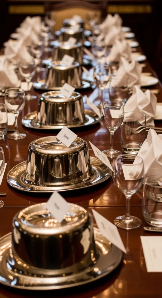 Use metallic hats as placeholders for dining. Lean small name cards against each hat or tie them on with thin ribbon. Choose smaller hats so the table doesn’t feel crowded. Keep the rest of the table décor simple to highlight the hats. This idea adds personality to dinner settings. For a low-cost version, only place hats at the ends of the table. Guests love the playful feel without needing large decorations.