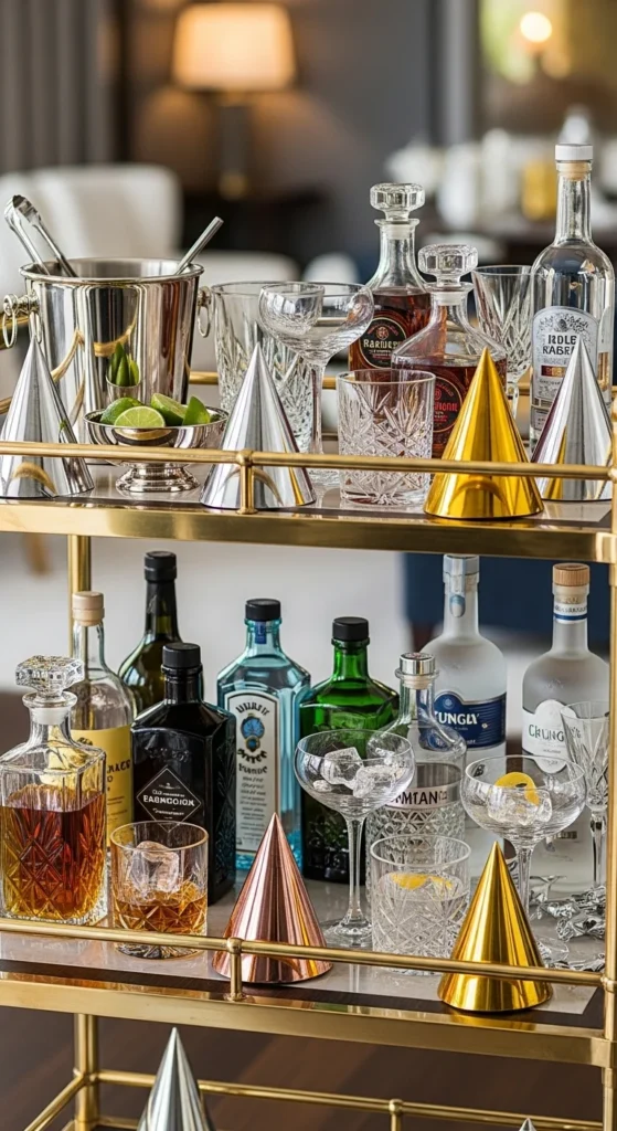 Decorate your bar cart with metallic hats tucked between bottles and glasses. Choose hats in finishes that match your drinkware. Place one hat on the top shelf and another on the lower shelf to distribute shine evenly. Add small LED lights for a soft nighttime glow. If you’re on a budget, limit the décor to a single hat; its shine still stands out. This setup makes your drink station feel lively without crowding it.
