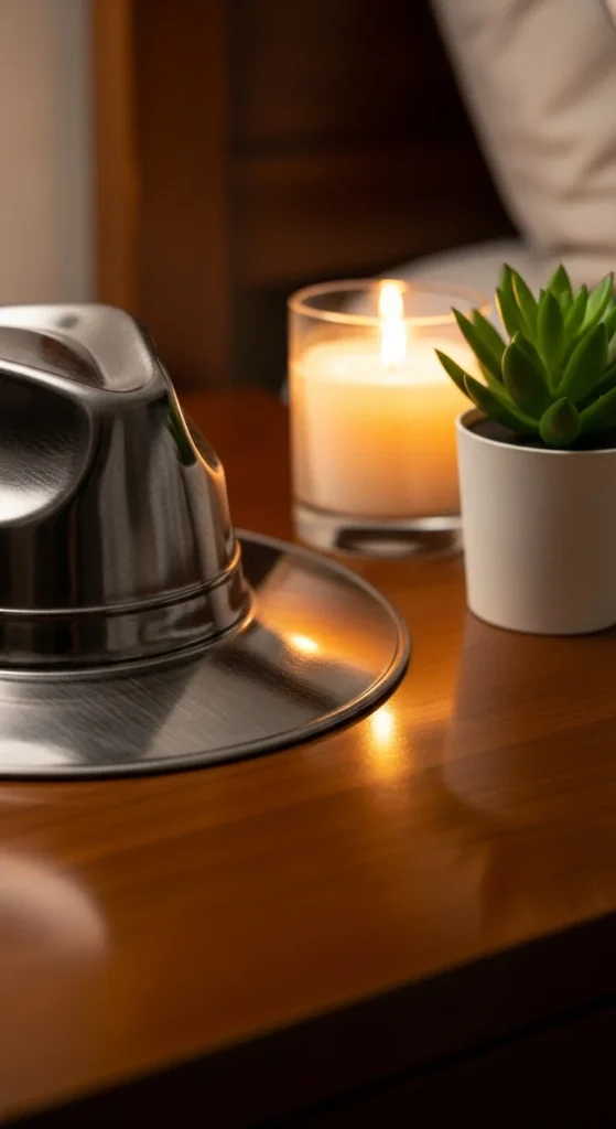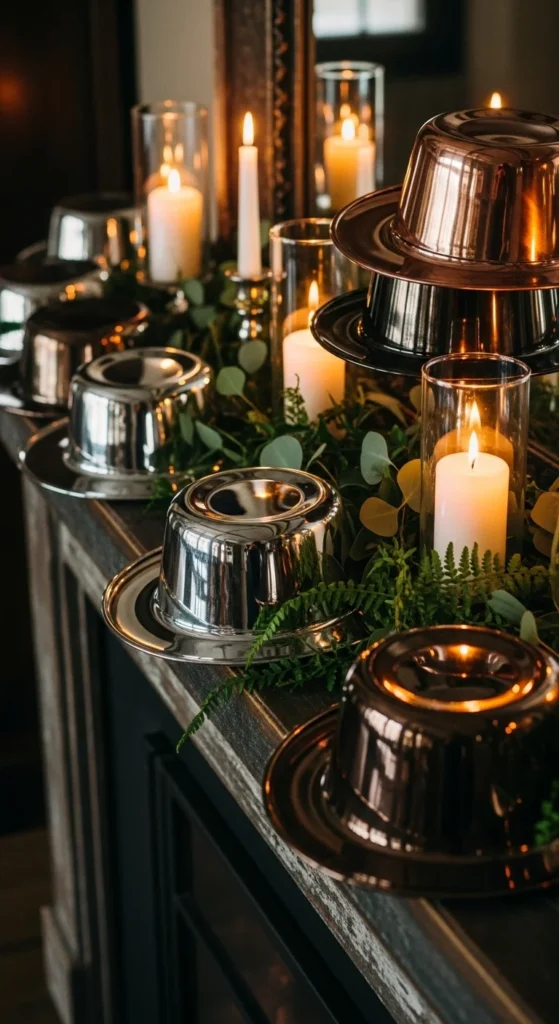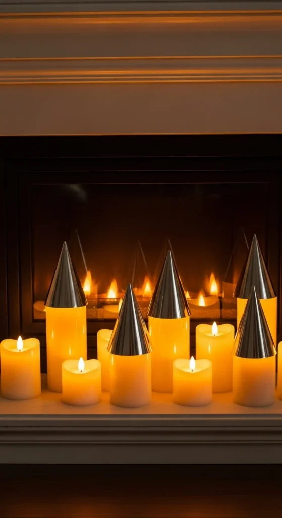 Place metallic hats on top of flameless candles to create a playful glow. The hats act like tiny shades, letting warm light bounce off the metallic finish. Use candles of different heights so each hat sits at a different level. This works on mantels, shelves, or dining tables. For small budgets, use inexpensive LED candles—they reflect beautifully on metallic surfaces. Avoid real flames. Add a few scattered ornaments around the candles for extra texture. Keep the hats slightly lifted so a soft halo of light escapes. It’s a quick way to create warm atmosphere without buying new décor pieces.