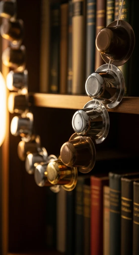 Hang small metallic hats as a tiny banner across your bookshelf. Use twine to attach each hat and let them hang loosely. Choose finishes that match your shelf décor. This idea adds subtle charm without cluttering the shelves. If you want a cost-friendly version, use fewer hats and let negative space fill the rest. Add a tiny bead or ribbon knot between hats for detail. It’s a great way to decorate without moving many items.