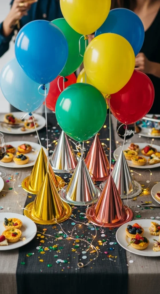 Turn hats upside-down to use them as playful confetti catchers. Scatter small amounts of confetti inside each hat so they look ready for the celebration. This works well for kids’ tables or fun party stations. You can group the hats by color or alternate finishes to create interest. If you want to keep costs low, reuse confetti from other décor items. Add small stands or risers under a few hats to bring height variation. Keep the surrounding décor minimal so the shine stays clear. This idea adds color and motion without taking up too much space.