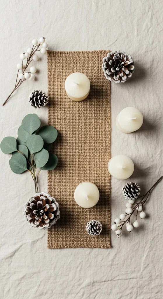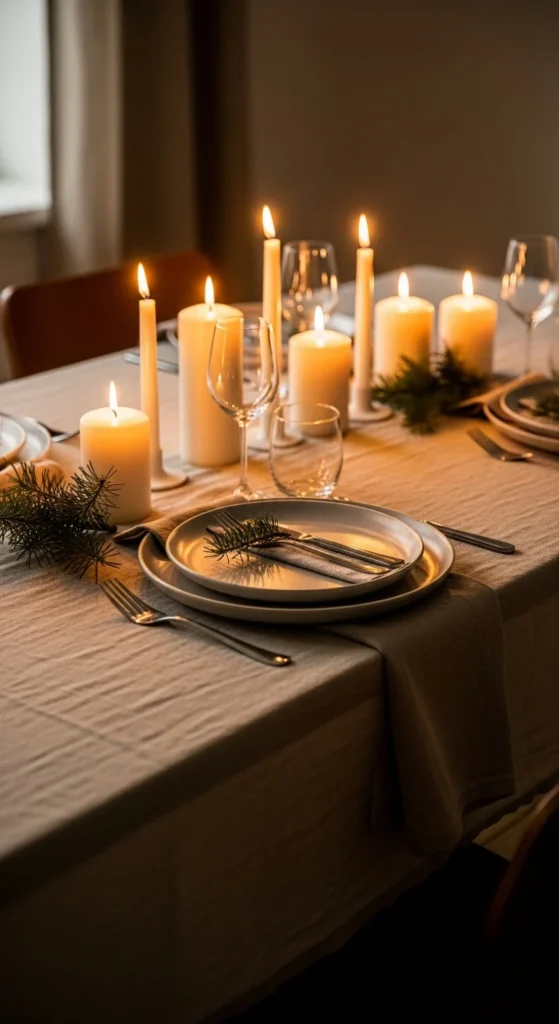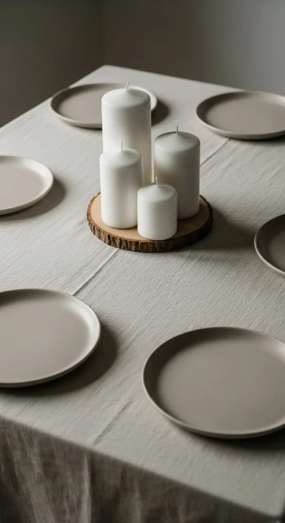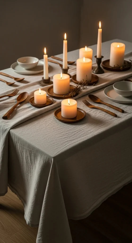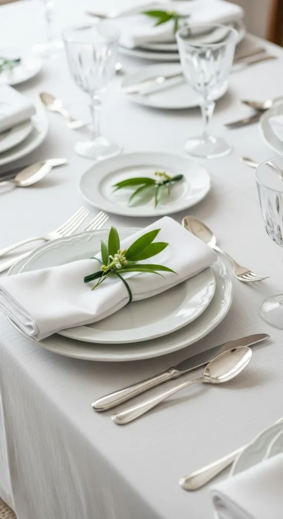 Use chalk-white linen for a fully clean look, then bring natural interest through leaf sprays clipped on napkins. Avoid busy florals. Stick with soft greens, muted browns, or cotton-white stems. Keep tableware simple such as round matte plates. Place candles far enough so wax doesn’t splash linen.