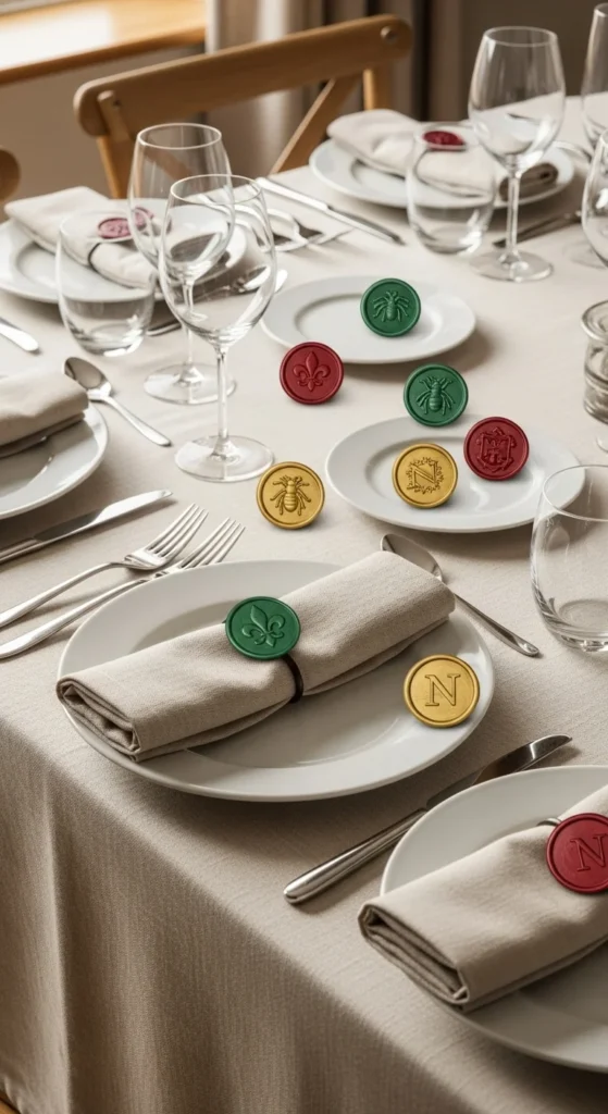 Use soft neutral linen, then add napkins wrapped with wax-seal labels. Choose seals in champagne, ivory, or copper. This adds a quiet decorative moment while keeping the table peacefully minimal. Stick to small font names or initials. Use fabric napkins with light texture for harmony.