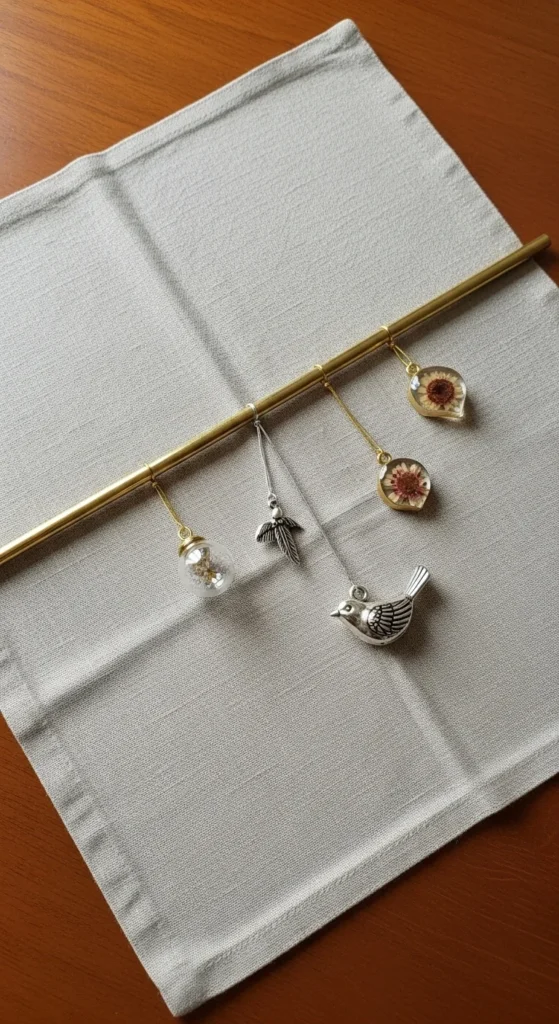 Lay linen and place a slim brass rod centerpiece stand that holds tiny charms or year-digit beads. Keep items very few so linen remains the main foundation. Add low-profile plates so the rod is visible without distraction. Spray rod with matte lacquer for soft shine.