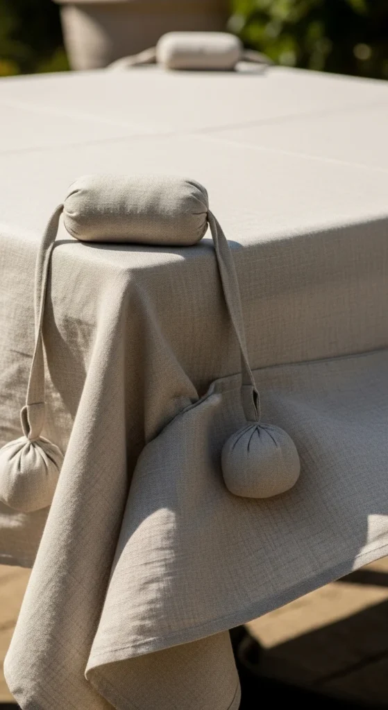 If the table is outdoors or near airflow, wrap small weights inside matching linen scraps and place them at each corner. This holds cloth steady without clips showing. Works well for patio dinners or balcony setups. Use LED tealights so flame stays safe in wind.