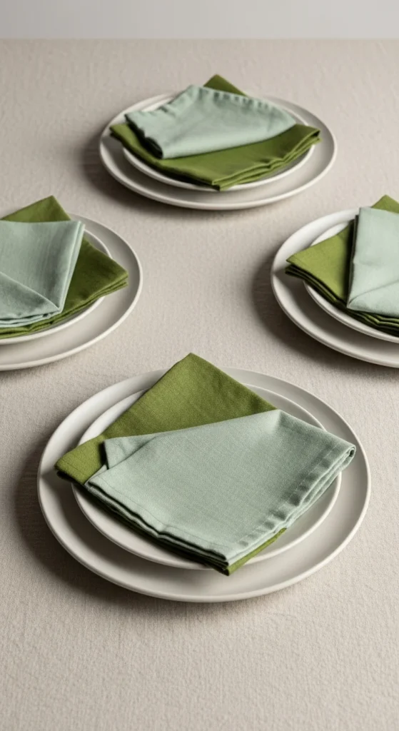 Choose linen in off-white and nest napkins in two tones like sand + ivory or charcoal + beige. Fold napkins softly and place inside plates. This tiny dual-color moment adds depth without heavy items. Keep plates matte so fabric textures are the main feature.