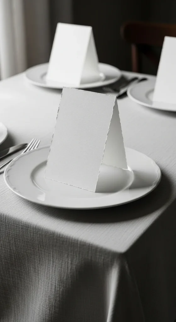Lay linen in natural tones and add plain paper menu cards on each plate. Use typewriter-style fonts and tiny spacing for a calm print look. Avoid graphics or large icons. This pairs well with low candles, simple glassware, and dried foliage.