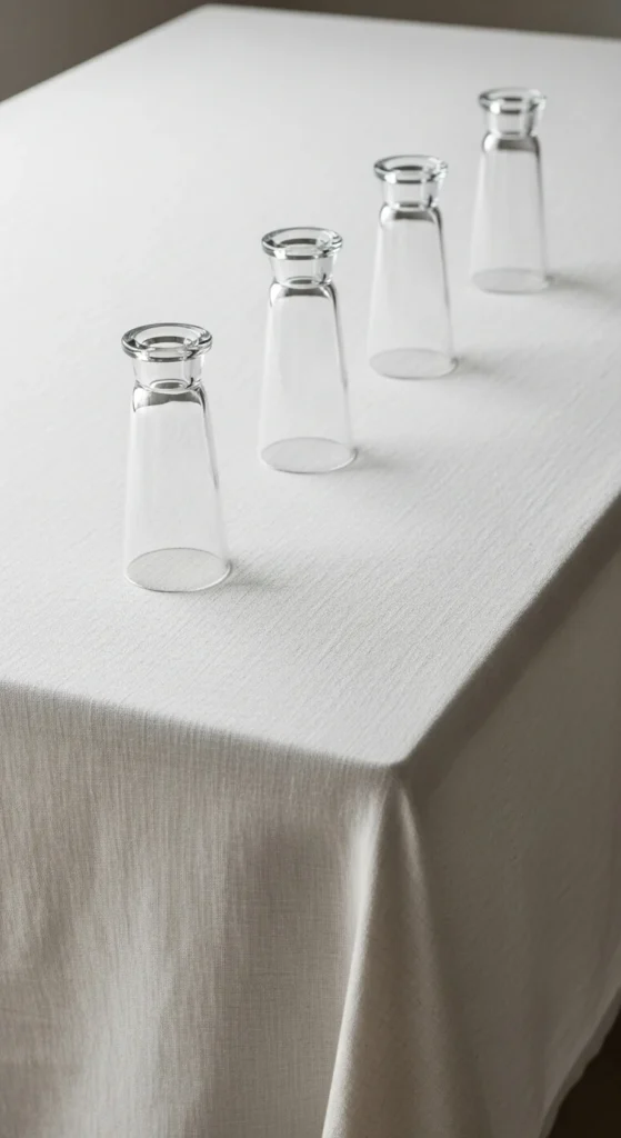 Pair natural linen with clear taper holders to maintain a light, see-through feel. Use white or sand-colored candles. Line holders in equal spacing along the table and keep height variations minimal. Wipe holders for clarity before lighting.