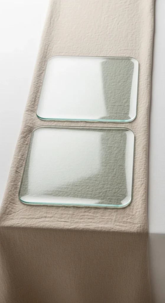 Place glass placemats over linen so texture stays visible. Choose round or square shapes depending on table size. The glass adds shine while linen adds warmth. Keep center decor minimal so texture remains visible.
