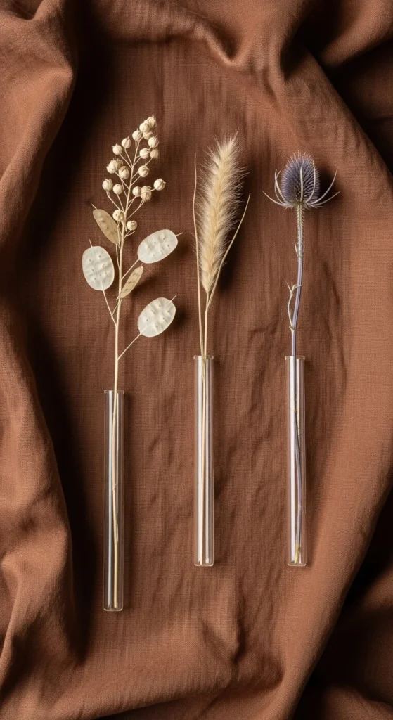 Pick a clay-tone linen that sits between brown and orange. Use dried stems like wheat or pampas placed in tiny glass tubes. Position tubes evenly along the table without crowding. This suits neutral dinnerware with a matte finish. Replace one stem with a pearlescent bead drop for variation.