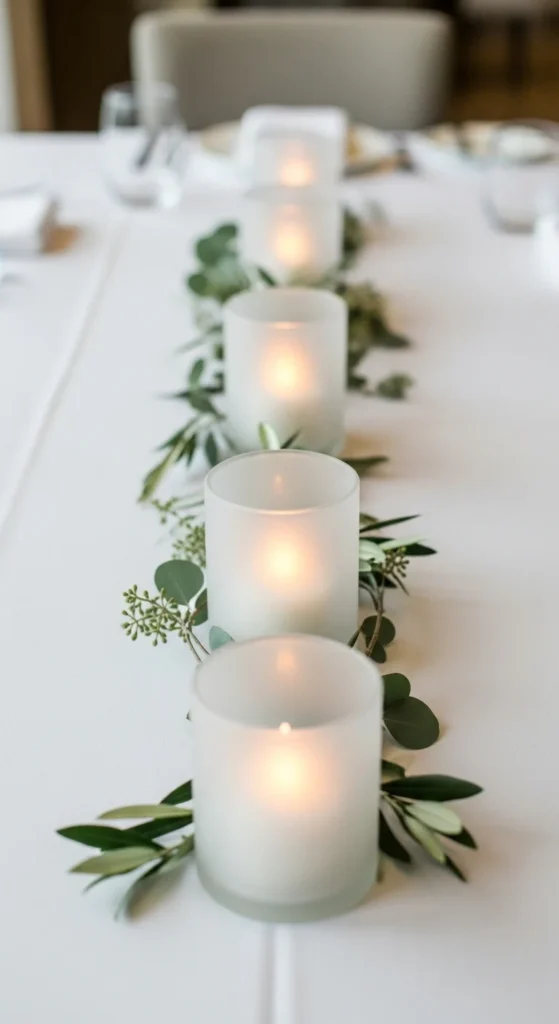 Use bright white linen for a clean base, then place frosted glass decor pieces such as candle holders, bud vases, or small tealight cups. This creates a wintery atmosphere without adding heavy color. Add only one thin greenery line across the center. Use clear plates or pearl-toned ceramic plates so decor stays soft. Wipe the linen with a steamer to remove lines before styling.