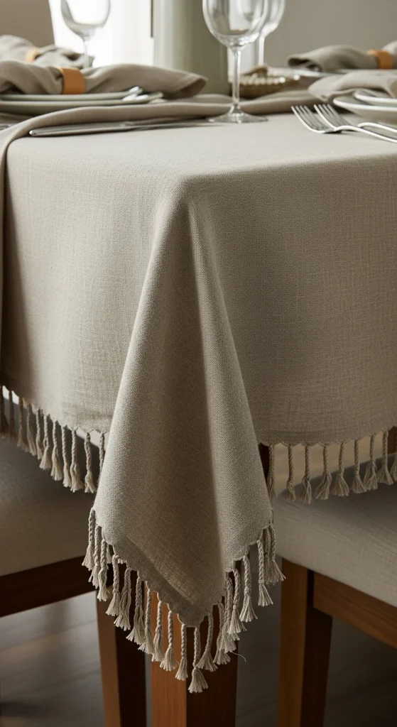 Pick a linen cloth with fringe edging for subtle detail. Allow fringe to hang lightly down the table sides. Pair with smooth items like glassware and satin ribbons to contrast texture. Keep centerpieces narrow so fringe remains the quiet star on the edges. Fold napkins with sharp lines to counterbalance the casual fringe.