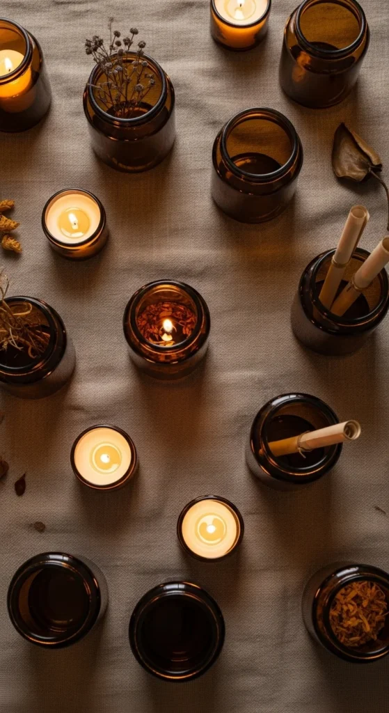 Spread a dusty beige linen base and place amber jars in a staggered line. Add slim LED candles inside jars so light glows softly. This suits small dining corners or cozy kitchen tables. Choose napkins one shade lighter than the linen to keep depth gentle. Add a single pine cone near each jar for subtle seasonal detail.