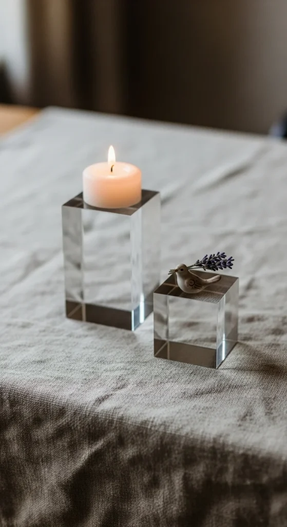 Place small acrylic risers on top of the oatmeal linen base to lift candles or decor slightly above the surface. This gives a floating layer effect while keeping linen visible. Use warm LEDs for soft reflection. Keep risers small so the linen stays dominant.