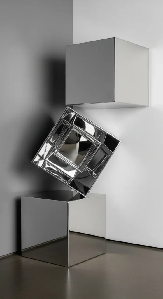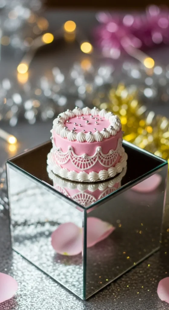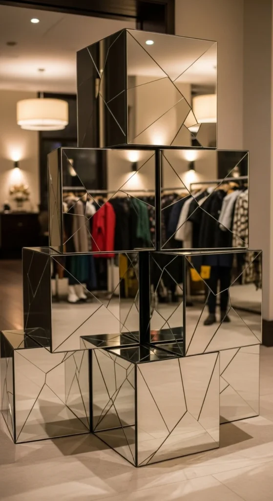 Stack three cube sizes in pyramid form at the entry so guests immediately notice reflections. Use lightweight bases such as hollow cardboard cubes reinforced with tape and foam. Attach small mirror tiles using strong craft adhesive placed neatly to avoid crooked lines. Leave small breathing gaps between some tiles so reflections shimmer instead of forming a solid mirror wall. Add LED candles or fairy lights on the floor edges so the cubes appear glowing. Consider a matte-black or champagne-floor mat underneath for shape definition. Position the stack slightly angled rather than pressed against the wall so corners reflect party lighting better. If you want personalized touches, place a small 4×6 printed countdown card on the smallest cube using a clear stand without blocking any reflections. This style suits indoor doorway corners as well as outdoor covered patios.