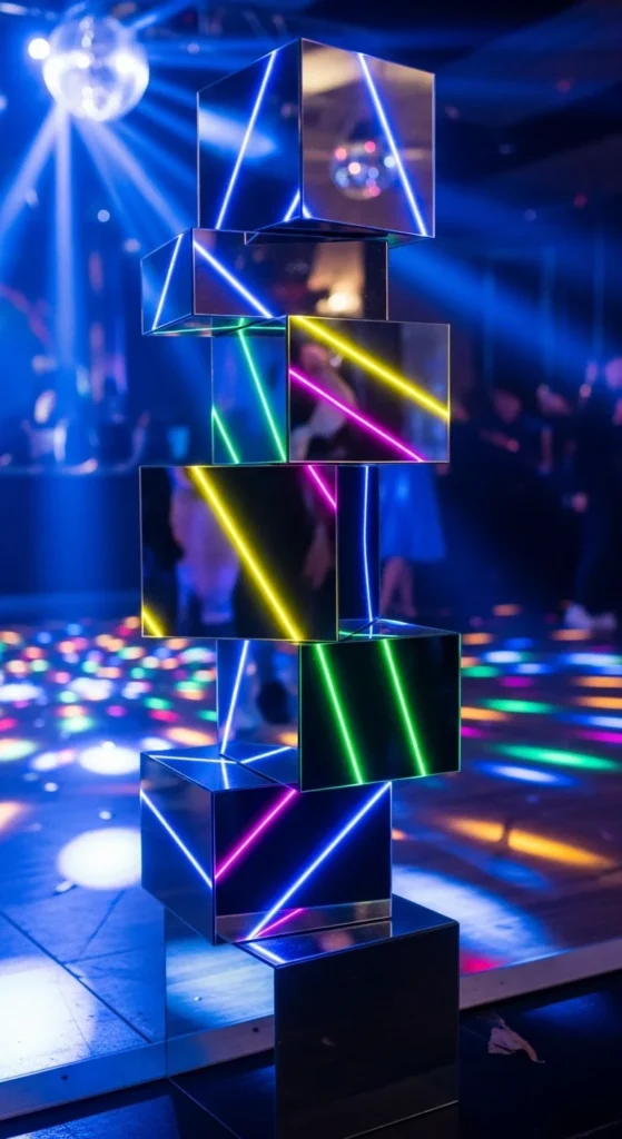 Place large mirror cubes near the dance floor to catch colorful disco effects. Stick LED strips behind the cubes for shadow glow. Keep edges smooth and safe. Works for late-night party energy.