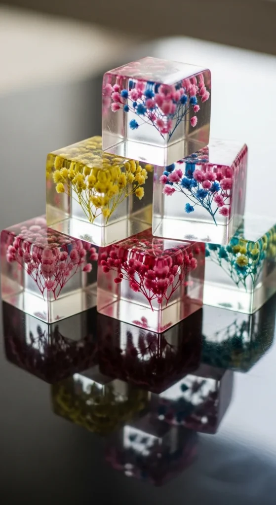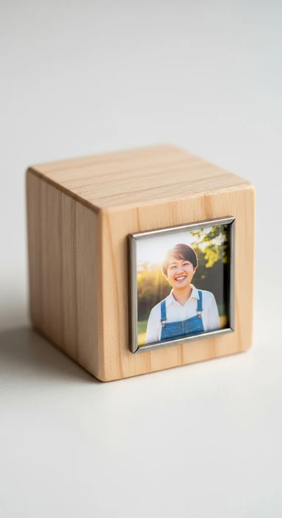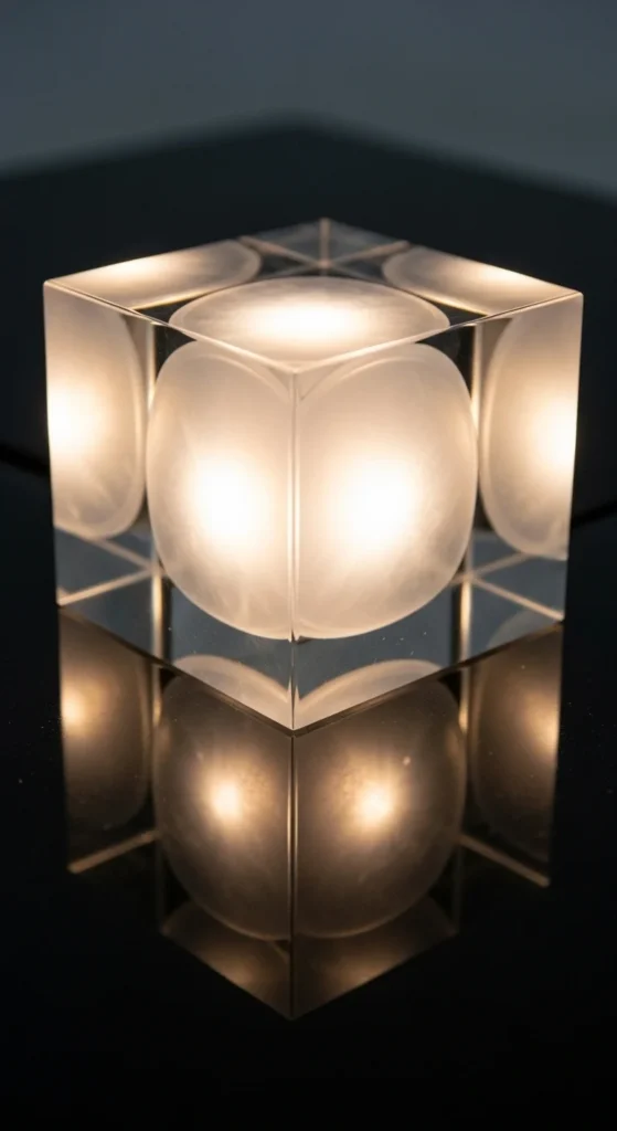 Attach a tiny clear clip holder on top for guest name cards or seating placements. Works well for dinner parties. Keep cube small (around 4–6 inches). Pair with warm lighting for shadow highlights.