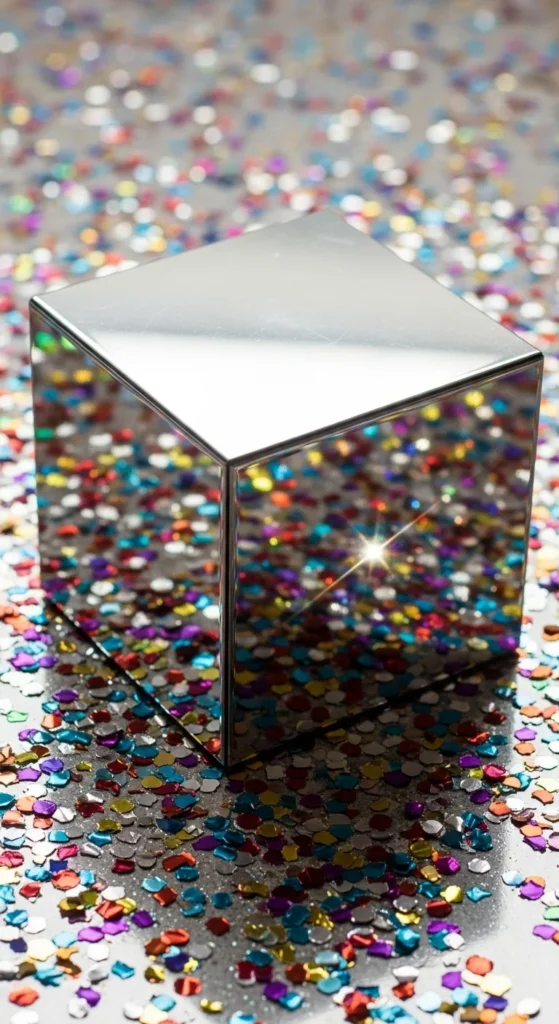 Place cubes on a confetti-filled rug or mat so reflection multiplies sparkles. Add a spotlight from side for shimmer.