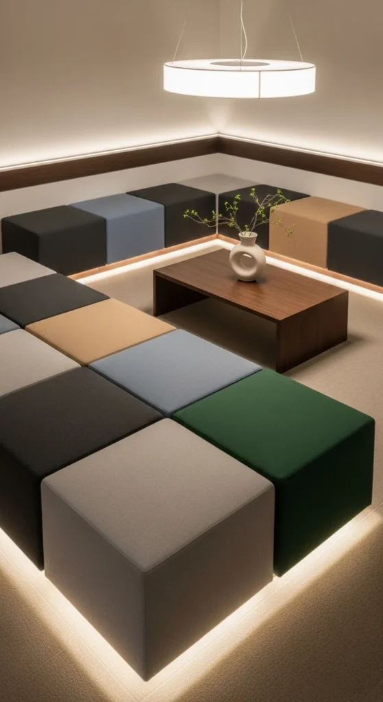 Arrange several sturdy cubes side by side like a bench. Add cushion-pads on top for comfort. Works in VIP lounge.