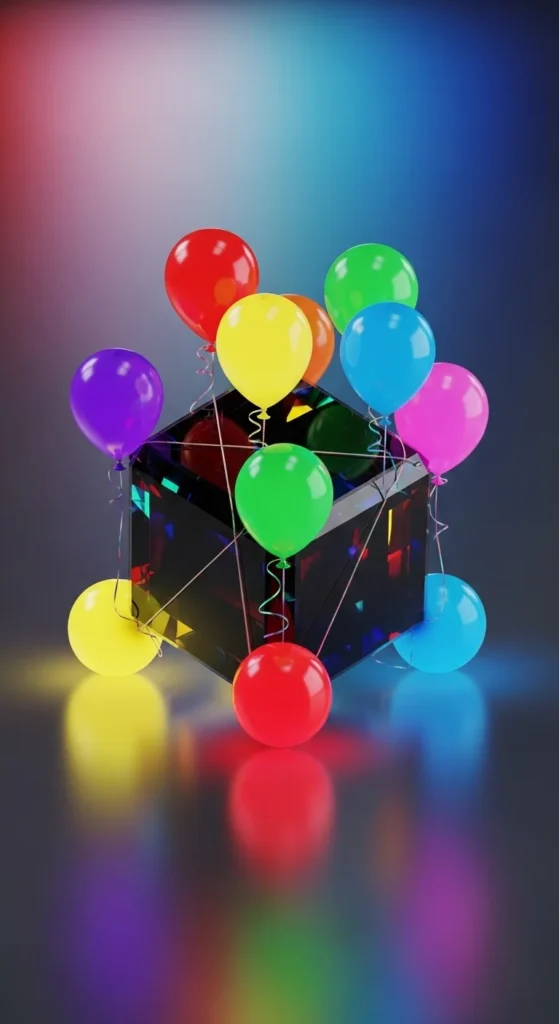 Tie helium balloons using clear thread to cube corners. Place cube near wall with fairy lights to reflect balloon colors.