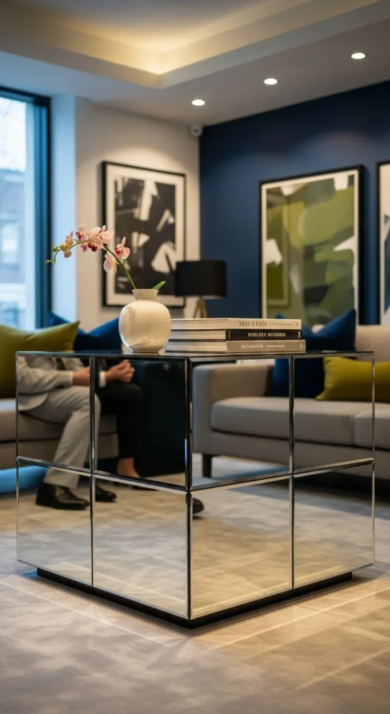 Use a lazy-susan style rotating base under a mid-size mirror cube so guests can move it slightly for photos. Place a clear acrylic sheet on top to protect tiles while holding drinks or props. Add a mini ring-light behind or beside the cube, not overhead, for side-reflection shadows. Keep top décor minimal, like a single metallic vase or champagne flute set. Invite guests to take selfies by rotating angles until reflections match their outfits. For a cost-friendly version, use a cardboard box with thinner mirror sticker sheets. Always seal tile edges with glossy clear glue to avoid loose pieces. Position the cube near lounge seating where people naturally gather.