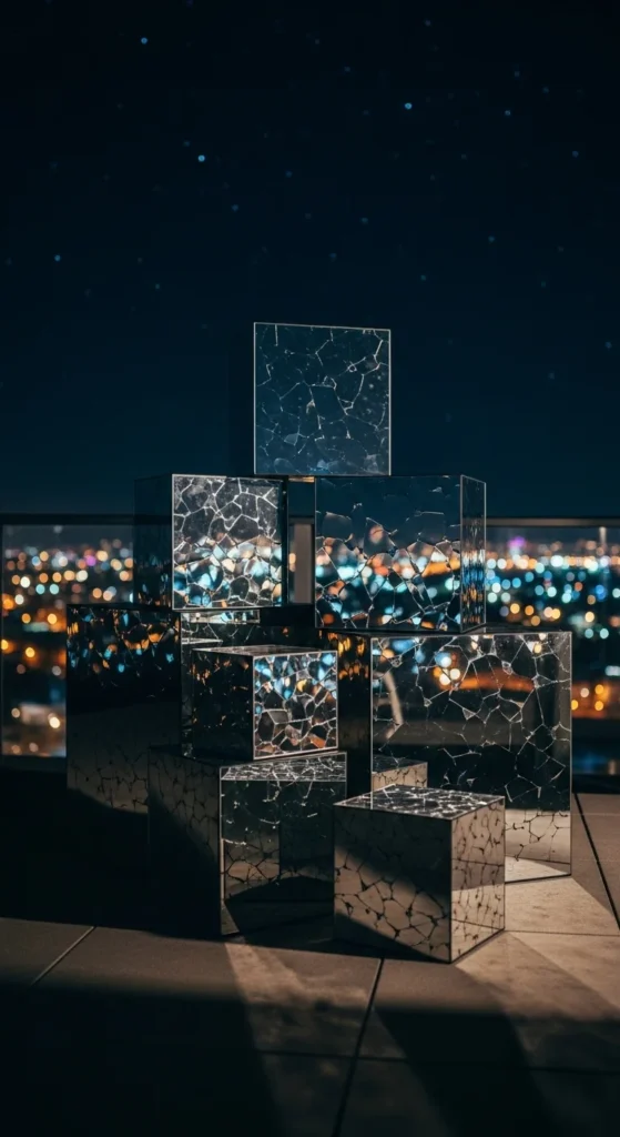 Place cubes near balcony rails so reflections capture city lights, stars, or fireworks. Use non-slip mats and secure with weather-friendly tape. Add slim LED candles or lanterns near cubes for low-light sparkle. Never place them near uncovered edges; safety comes first. Works best for penthouses or rooftops with visibility.