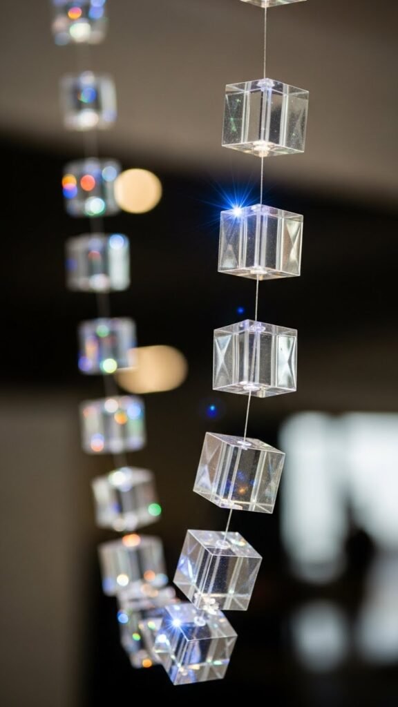 Make tiny lightweight cubes using cardboard and mirror stickers. Hang them on nylon thread from ceiling rails. Add micro LED strands behind them to create glimmering motion. Keep height varied for dynamic photo shots.