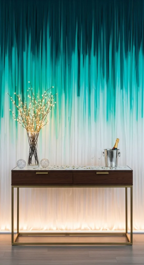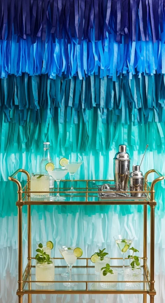 Set up a midnight-to-aqua ombré behind your bar cart for an instant party zone. Use deep navy or midnight blue streamers at the top. Shift into teal halfway down, then finish with pale aqua near the floor. Attach the streamers to a tension rod if you’re renting or want zero wall marks.