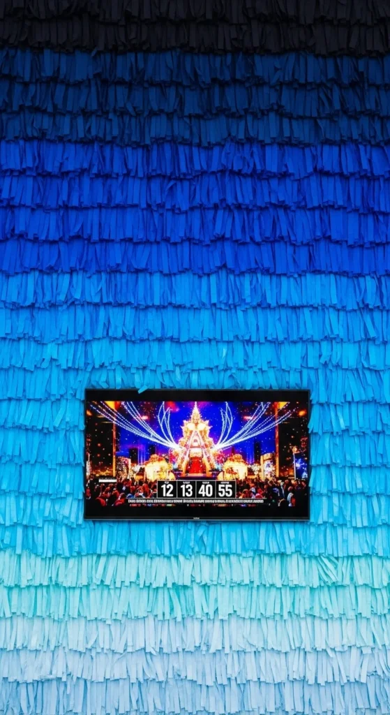 If you’re trying to keep things affordable, skip the area directly behind the TV and only fill the exposed edges. This cuts down on material while still giving the illusion of a full wall. Use clear tape on the back and sides so no hardware shows from the front. Add a small cluster of balloons in matching blues near the floor for extra depth. Guests watching the countdown will enjoy a styled backdrop without you rearranging furniture.