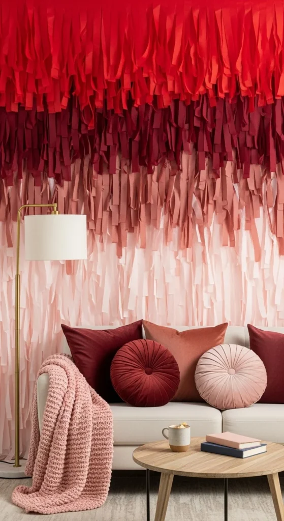 Turn a quiet corner into a wine-to-blush ombré lounge. Hang streamers that fade from deep wine or burgundy down to soft blush. Place two chairs or floor cushions in front, plus a small side table for drinks.