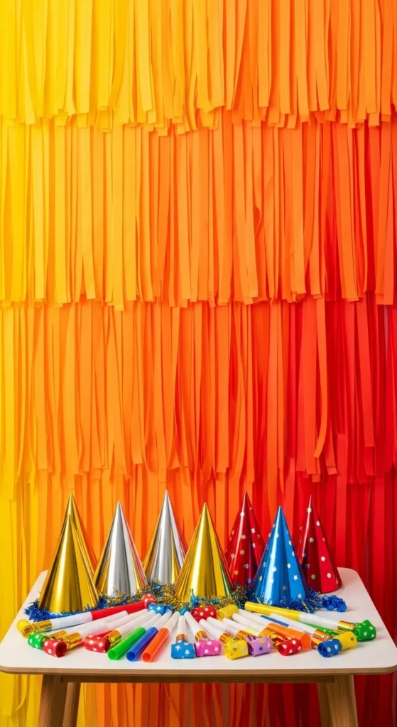 This wall works well behind a sofa or in a hallway. If you are working with a small budget, buy one roll of metallic streamers and mix it with matte paper in similar shades. The shinier strips will catch the light enough to make the whole wall feel luminous. Keep decorations around it minimal—a few candles, a plant, or a small bench is enough. When the party ends, carefully roll the streamers up and store your favorite colors for next year. It’s an easy way to create a glam photo station with very little effort.