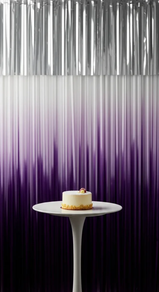If your budget is small, reserve the silver streamers for just the top row and corners, then fill most of the wall with lilac. Add a few metallic sprinkles or sugar decorations on the dessert to echo the wall colors. Keep plates and napkins clean and white so the gradient feels refined instead of busy. This arrangement is especially effective if your dessert table is compact and you want one focus point for photos.
