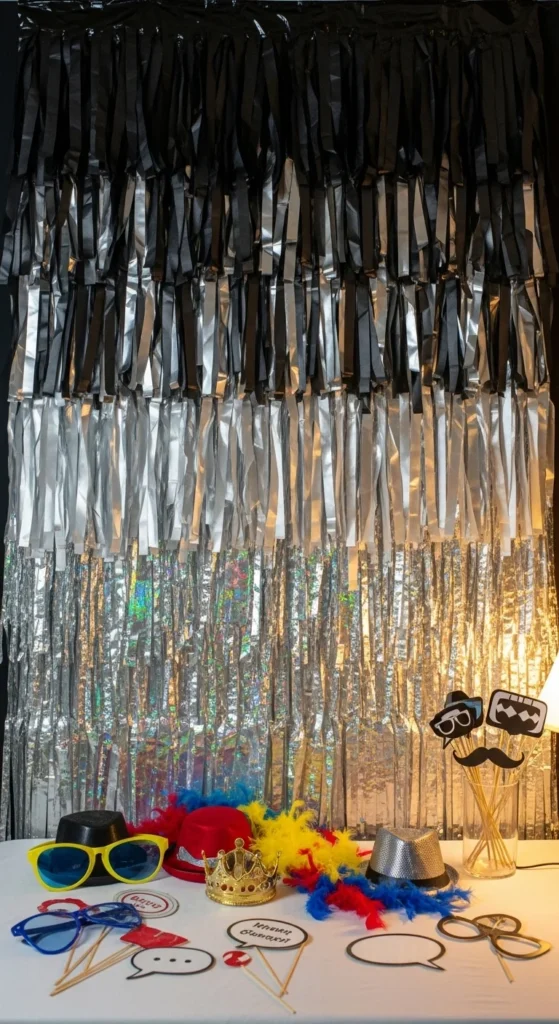 Create a black-to-holographic ombré wall behind your DIY photo booth. Hang black streamers at the top, metallic silver in the middle, and holographic or iridescent strips near the bottom. Place a basket of props such as glasses, hats, and beads in front.