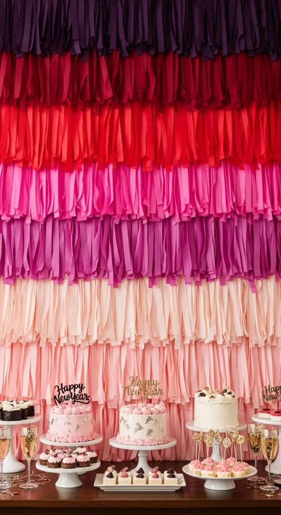 If your budget is tight, focus more strips in the middle color and fewer in the darkest shade. You can even cut longer streamers in half to double your coverage. Add a simple white tablecloth and plain cake stands so the wall stays the star. A few metallic accents, like silver confetti on the table, help the pink tones feel more New Year ready. This setup works nicely in small dining rooms or apartments because everything happens on one wall.