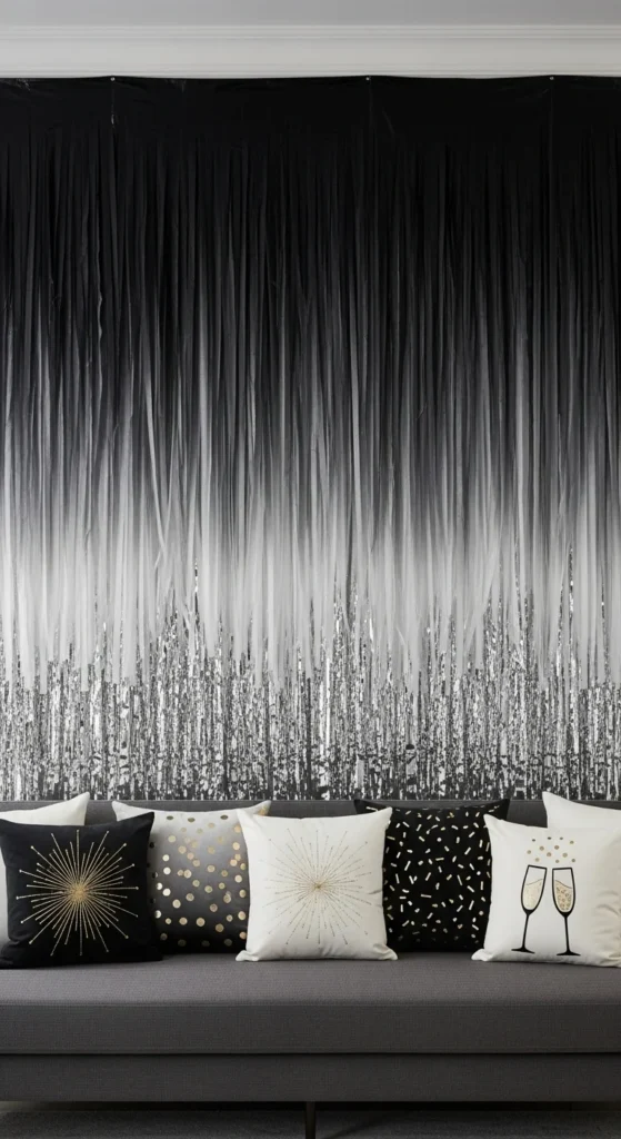 Hang the streamers behind your sofa so the wall acts as a stylish backdrop for group photos. To save money, skip specialty party streamers and cut strips from inexpensive plastic tablecloths instead. Layer the strips slightly so the wall looks full without needing tons of material. Add silver cushions, a black throw, or simple white candles on the coffee table to echo the color story. This look is especially helpful if you want New Year décor that still feels grown-up and easy to keep up for a few extra days.