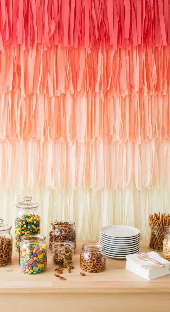 Brighten your snack station with a coral-to-cream ombré that feels warm and inviting. Use coral streamers at the top, pale peach in the middle, and soft cream at the bottom. Attach them to removable hooks or a strip of painter’s tape for quick setup and removal.