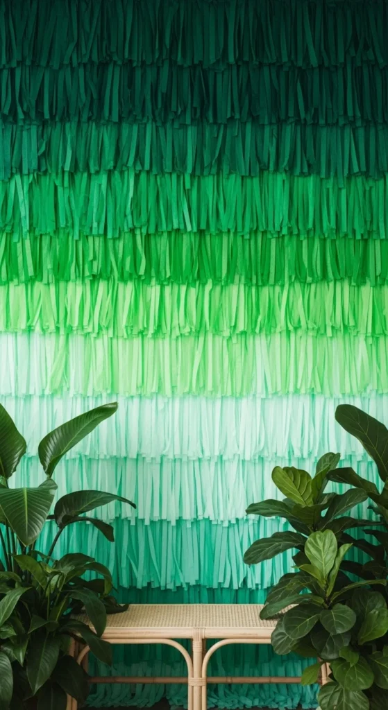 This setup works nicely in an entryway or corridor. To keep spending down, buy just two shades and make the third by mixing strips or slightly staggering their placement. You can also cut strips from green tablecloths if streamers are limited. Add a simple bench or shoe rack under the wall so the space stays functional. The result is a New Year backdrop that feels cozy enough to keep for weeks after the party.