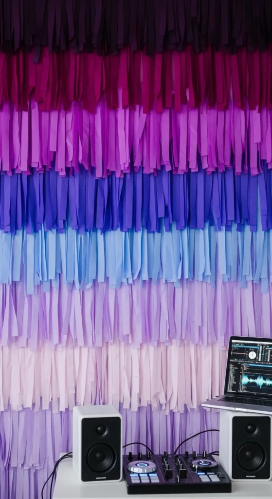 Turn your music corner into a plum-to-lavender ombré stage. Hang streamers that fade from deep plum to violet, then lavender near the floor. Place speakers, a compact DJ stand, or just a simple Bluetooth speaker table in front.