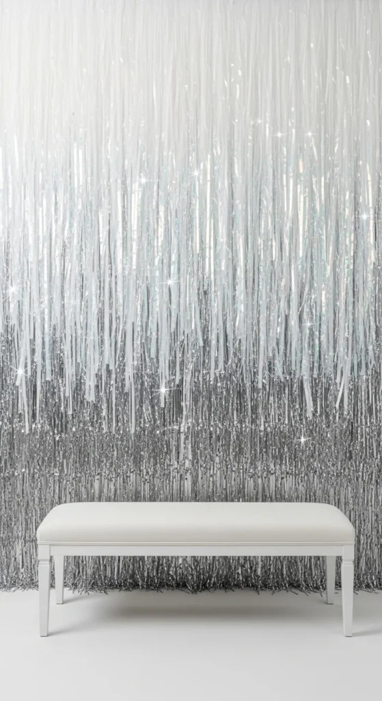 If you want to stretch your décor budget, mix silver with iridescent strips, then fill the rest with white streamers. The reflective pieces make the lighter colors seem more detailed. Add a small basket with fun New Year props—star glasses, tiaras, or simple hand-held signs. Keep the bench neutral so outfits pop in photos. This setup works in narrow hallways or unused corners, turning them into a mini studio with just a few supplies.