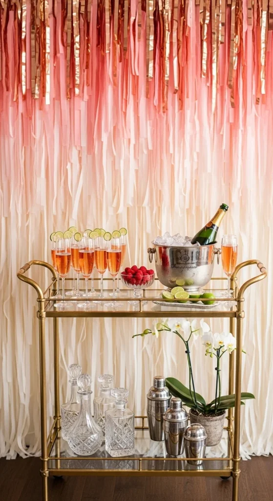 Pair a rose-gold ombré wall with your drink station for a warm, chic effect. Use rose gold at the top, blush in the middle, and soft beige or ivory at the bottom. Hang the streamers behind the cart, then add a few matching drink stirrers or napkins.