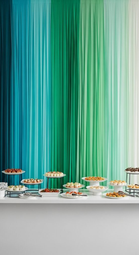 If you’re aiming for low cost, buy only two shades and stagger them so they appear to shift gradually. Label each dish with small cards instead of buying themed serveware. The color fade behind the table creates enough visual interest on its own. Add just a few metallic touches, such as gold utensils or silver chargers, so nothing feels flat. Guests will naturally gravitate toward the buffet since it looks intentional and festive.
