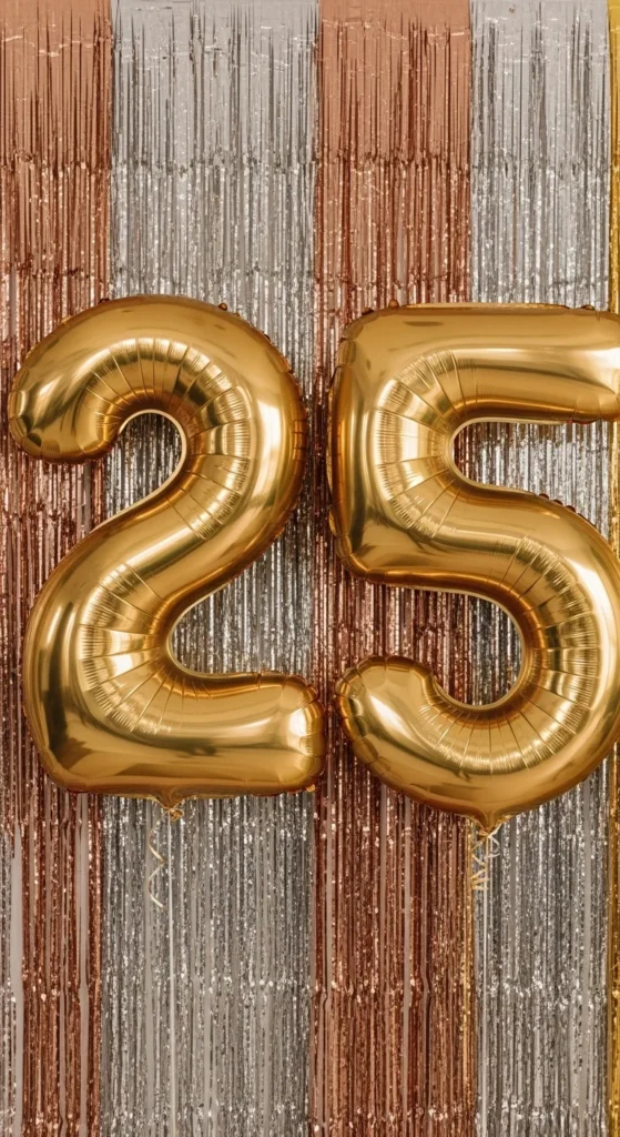 Hang metallic fringe curtains behind your balloon numbers to create instant depth. Position the balloons slightly forward so the fringe sparkles behind them.