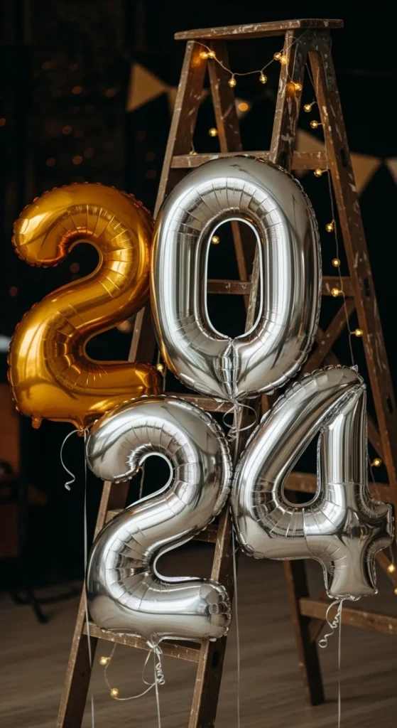 Use a simple decorative ladder as a structure for your balloons. Lean the numbers gently against it. Add small lights or mini garlands along the ladder steps.