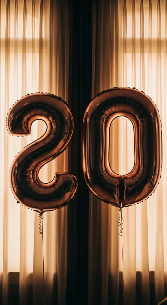 To reduce spending, skip a full arch and instead create two mini clusters—one on each side. Add small greenery pieces or faux leaves to soften the metallic finish. Guests feel the party vibe immediately when they walk in. This setup works great even in narrow entryways. Keep surrounding décor simple so the numbers stay the focal point. Rose-gold lighting or a candle lantern near the base adds warmth for evening celebrations.